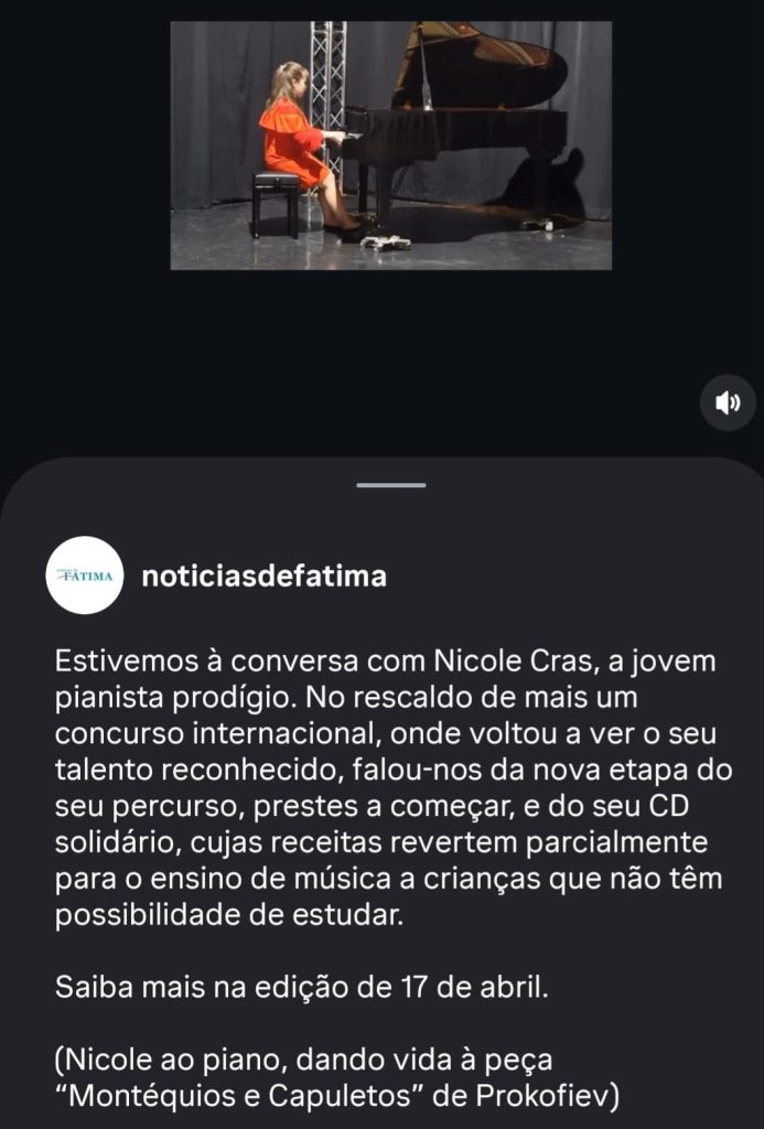 She is chasing dreams through her first steps in composing and mastering the piano, performing in concert halls and unique venues — including the Grutas de Mira de Aire caves in Portugal. Her journey takes her to competitions and stages across Europe, each performance adding a new note to the story she is creating.